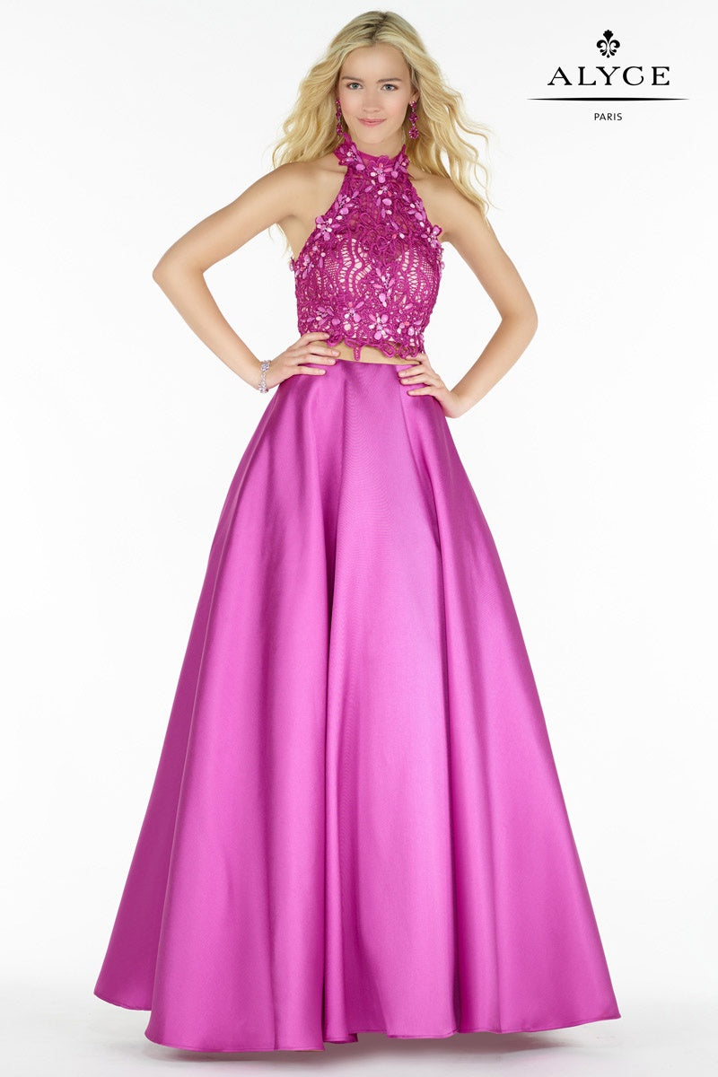 ALYCE Paris style 6764 in Magenta is a 2 Piece dress with beaded lace halter top and a-line mikado skirt.