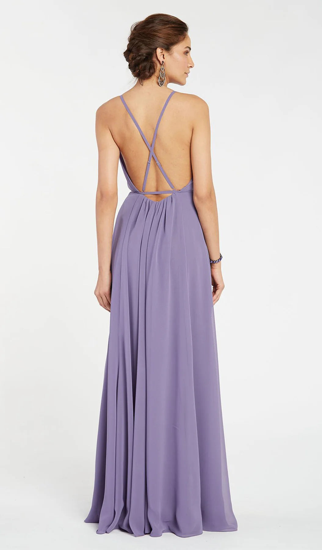 This elegant style showcases a wrapped bodice flaunting a low v cut and simple criss crossed open back. Flowy georgette skirt flows out from the simple clinched waistband, finishing off with a lovely swept train.