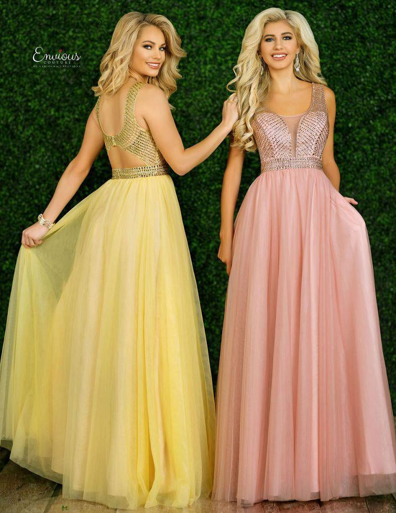 Envious Couture 1448 in Dusty Rose features a beaded bodice with a plunging sweetheart neckline and flowing tulle a-line skirt.