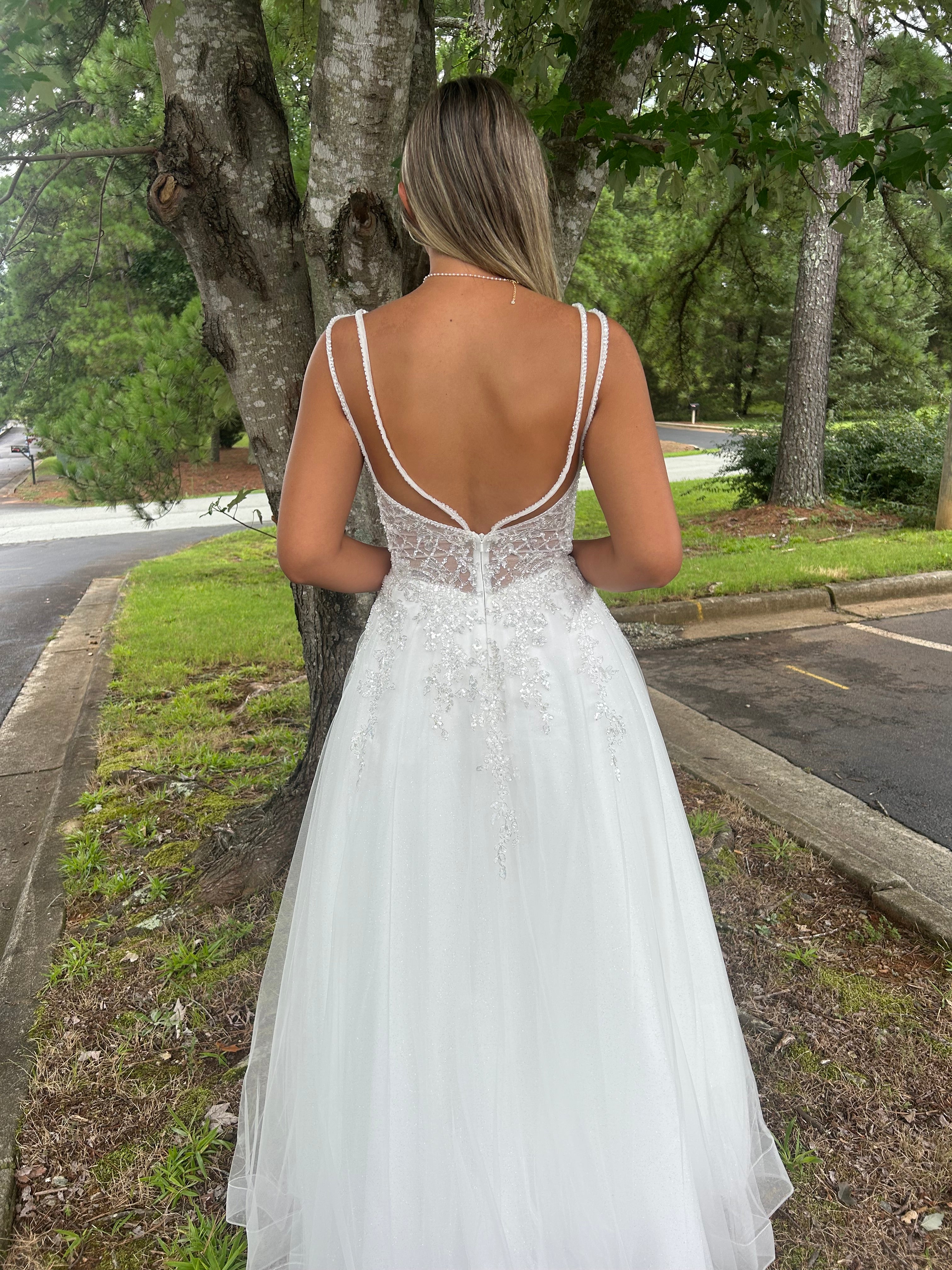 FLAIR Prom style 25037 is a tulle A-line dress featuring an illusion beaded bodice with lace applique with a V-neckline. Available in Diamond White, Black and Wine (Burgundy).