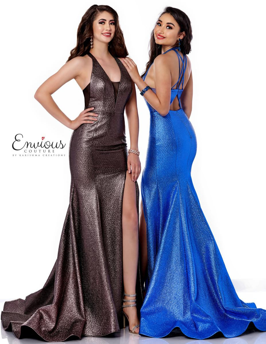 Envious Couture E1741 in Coco by Karishma Creations is a full length shimmering bronze tone Prom Dress featuring a plunging halter neckline with criss cross back detail. A fit-n-n-flare silhouette in a novelty fabric with a high slit and sweet train.