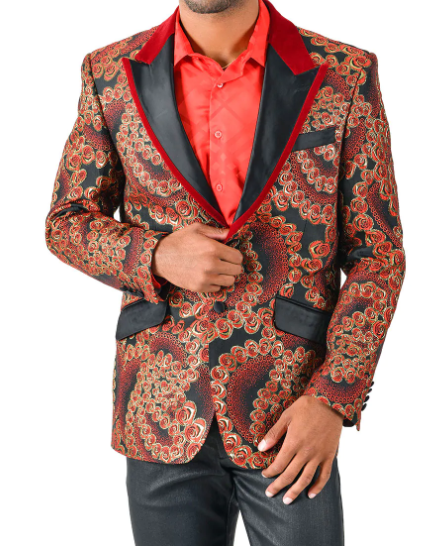 Barabas Red and Gold Rose Print Design Fashion Jacket with Black Satin and Red Velvet Peak Lapels