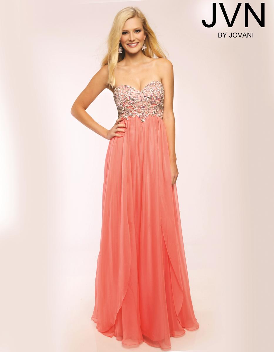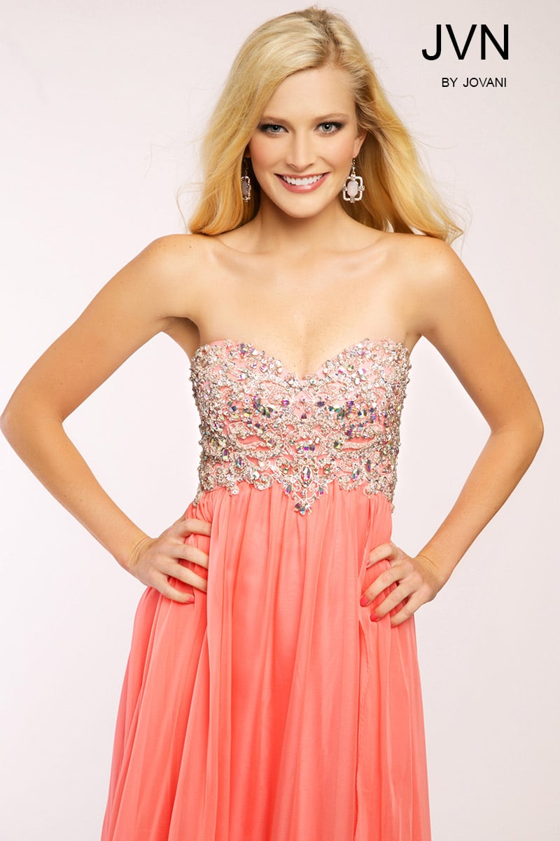 JVN by Jovani style 98616 is a coral strapless sweetheart chiffon slim a-line dress with jeweled bodice.