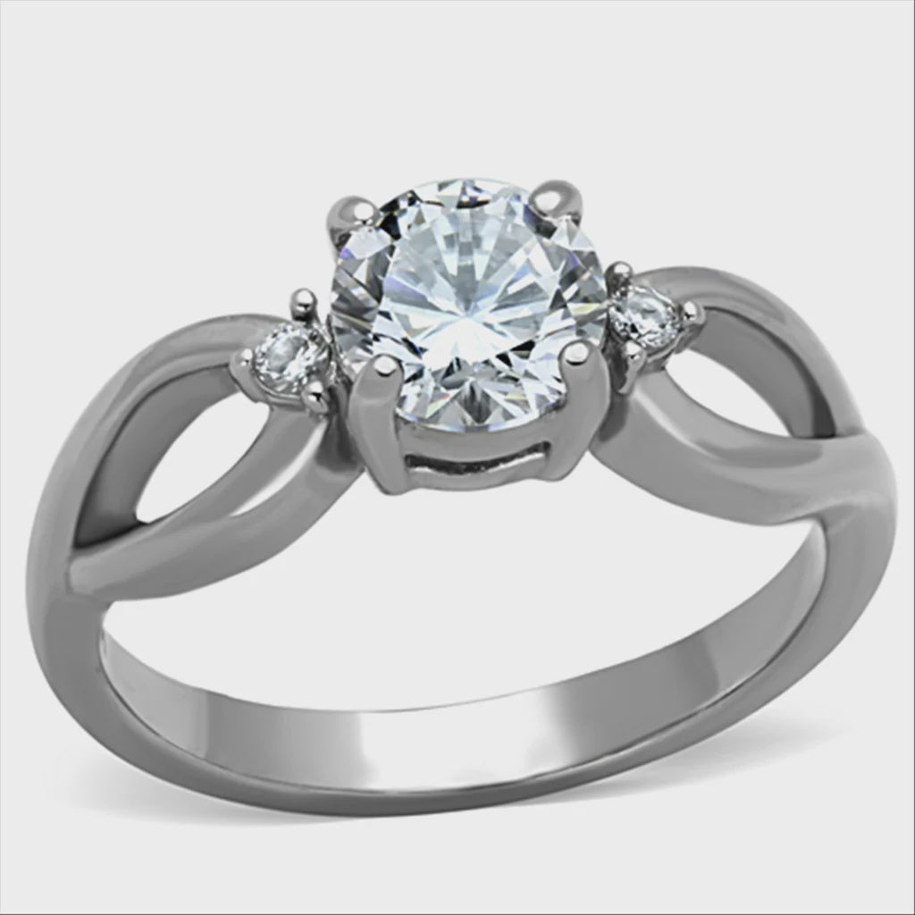 Simple yet truly stunning, this stainless steel fashion ring for women features a uniquely designed band and eye-catching triple-A grade CZ crystals. Ring, Stainless Steel, High polished (no plating), AAA Grade CZ, Clear, Round
