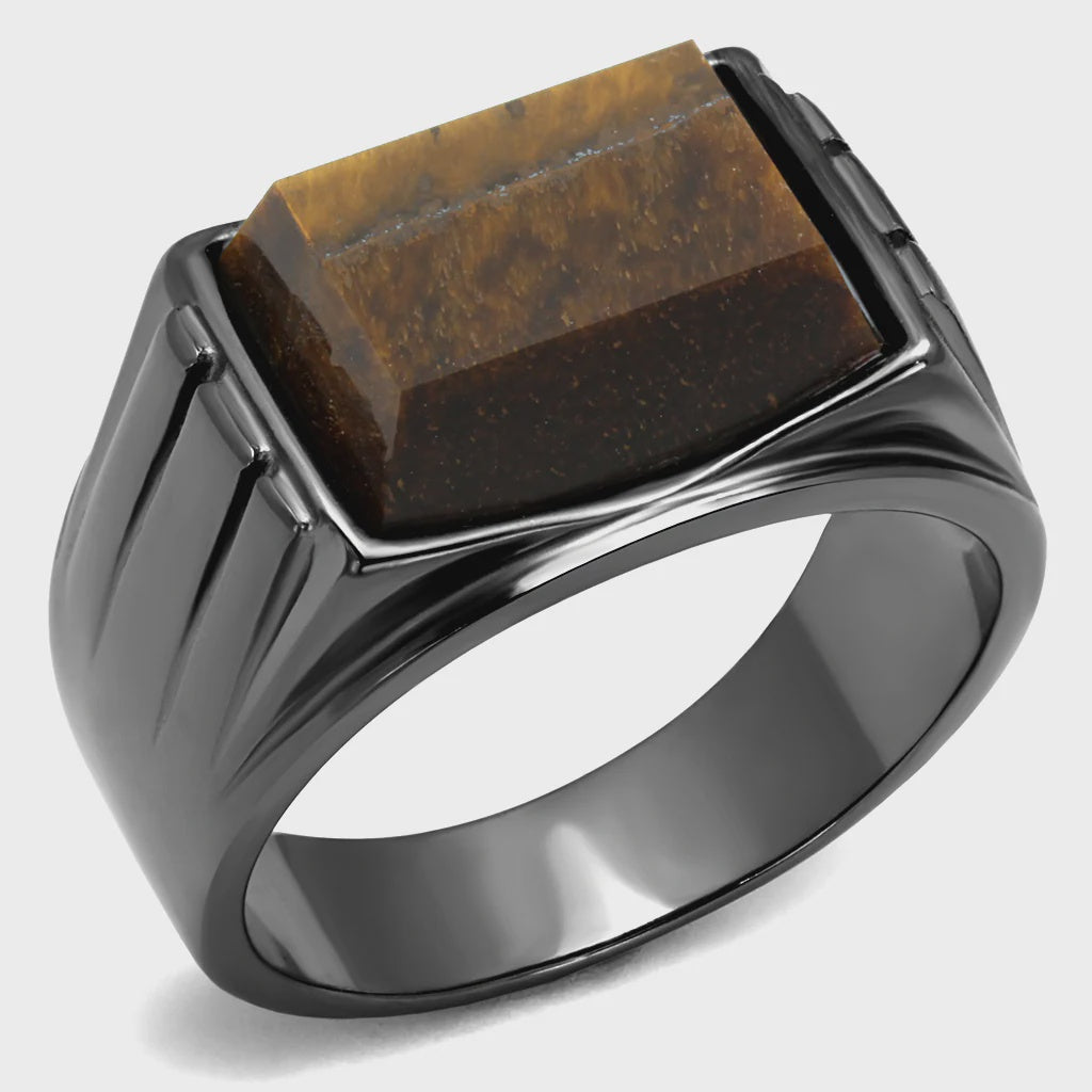 Ideal for accessorizing edgy and rugged outfits. This light black plated stainless steel ring for men boasts a synthetic tiger eye topaz center stone.