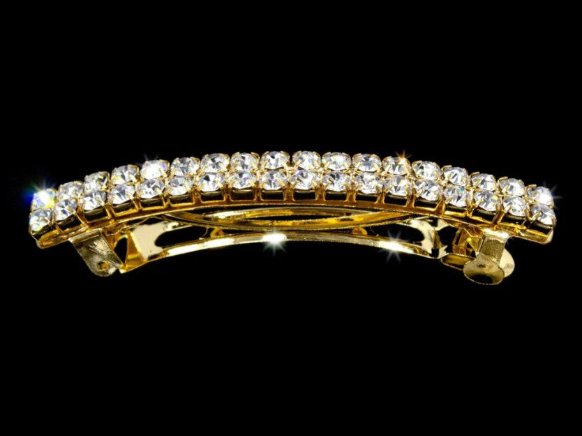 Two Row Crystal Rhinestone Barrette measures 2 3/4" x 3/8" and is plated in gold.