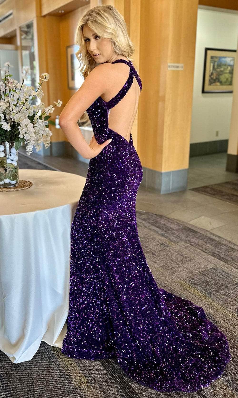 Consider a regal evening with this stunning Jasz Couture 7404, all eyes will be on you at the center of attention. Featuring a sleeveless bodice adorned with a plunging V-neckline and an open back with gracefully crisscrossing straps, this sequined dress is perfect for an evening event. The sheath-shaped skirt is elegantly completed with a sweeping train that extends to the full-length hem of the gown. Prepare to be the topic of conversation in town when you grace the occasion with this extraordinary creation from Jasz Couture 7404.