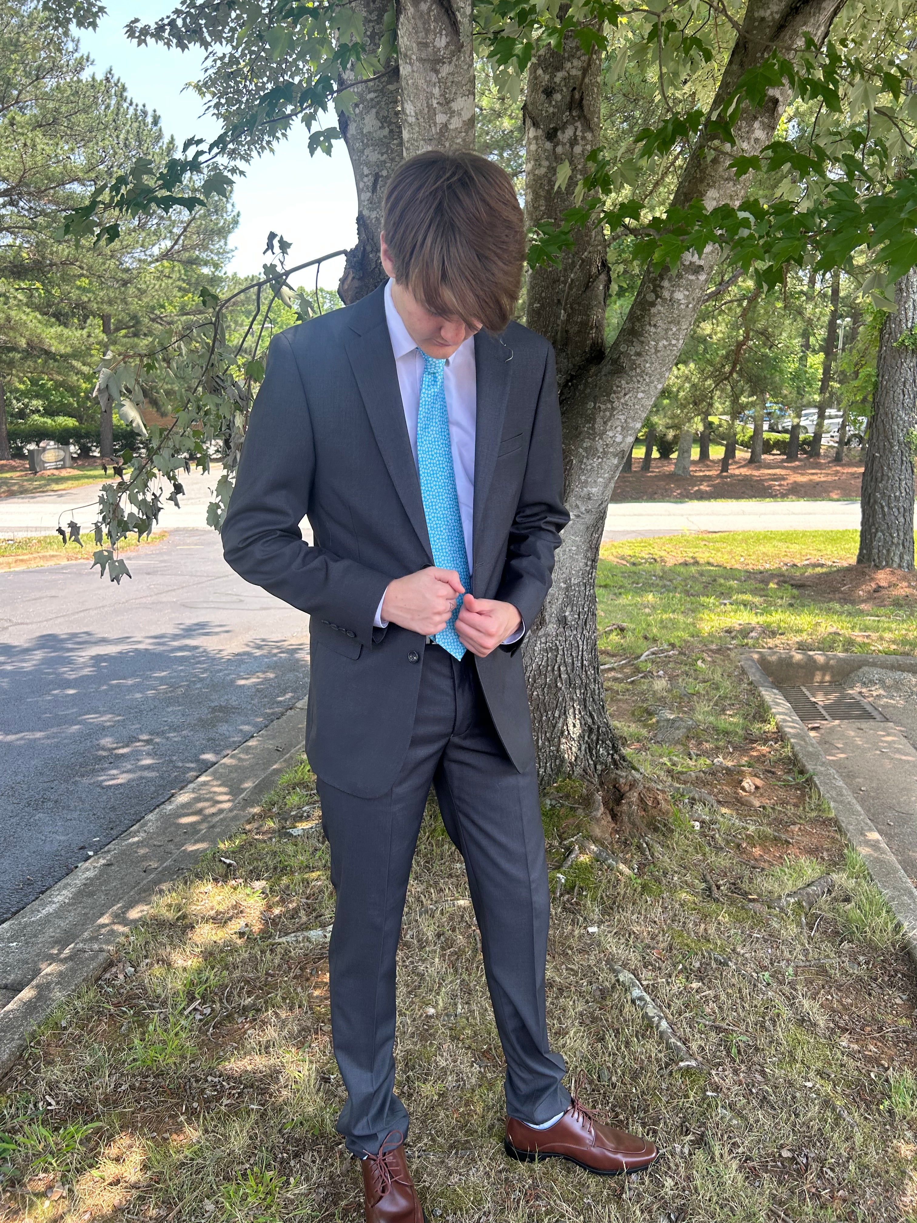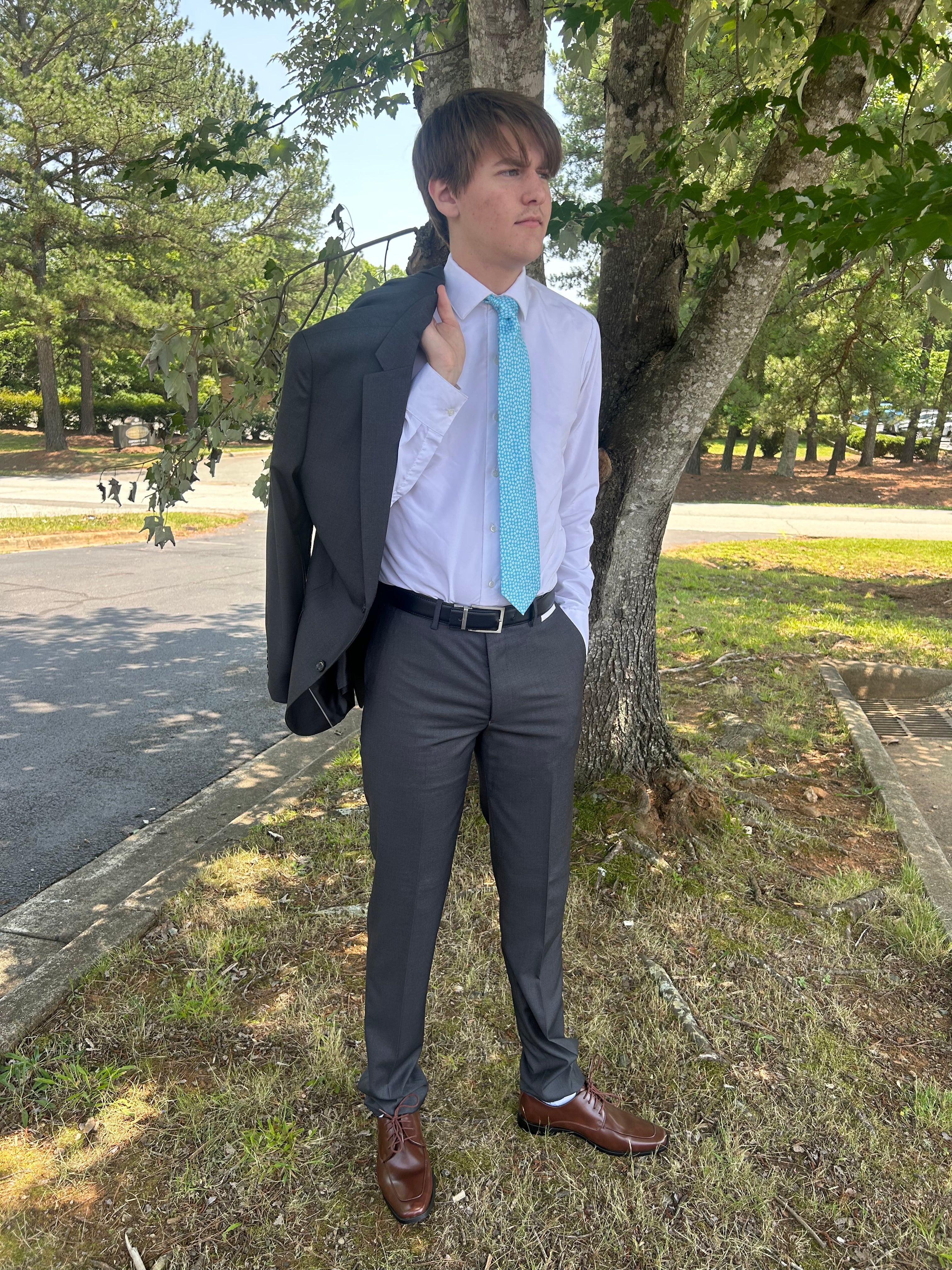 New two piece Italian designed Gray Suit. The traditional notch lapel makes this suit perfect for any formal or semi-formal occasion. Luxurious microfiber poly viscose fabric. Includes flat front matching pants. Pants will be shipped unhemmed and will need to be hemmed to the right length.