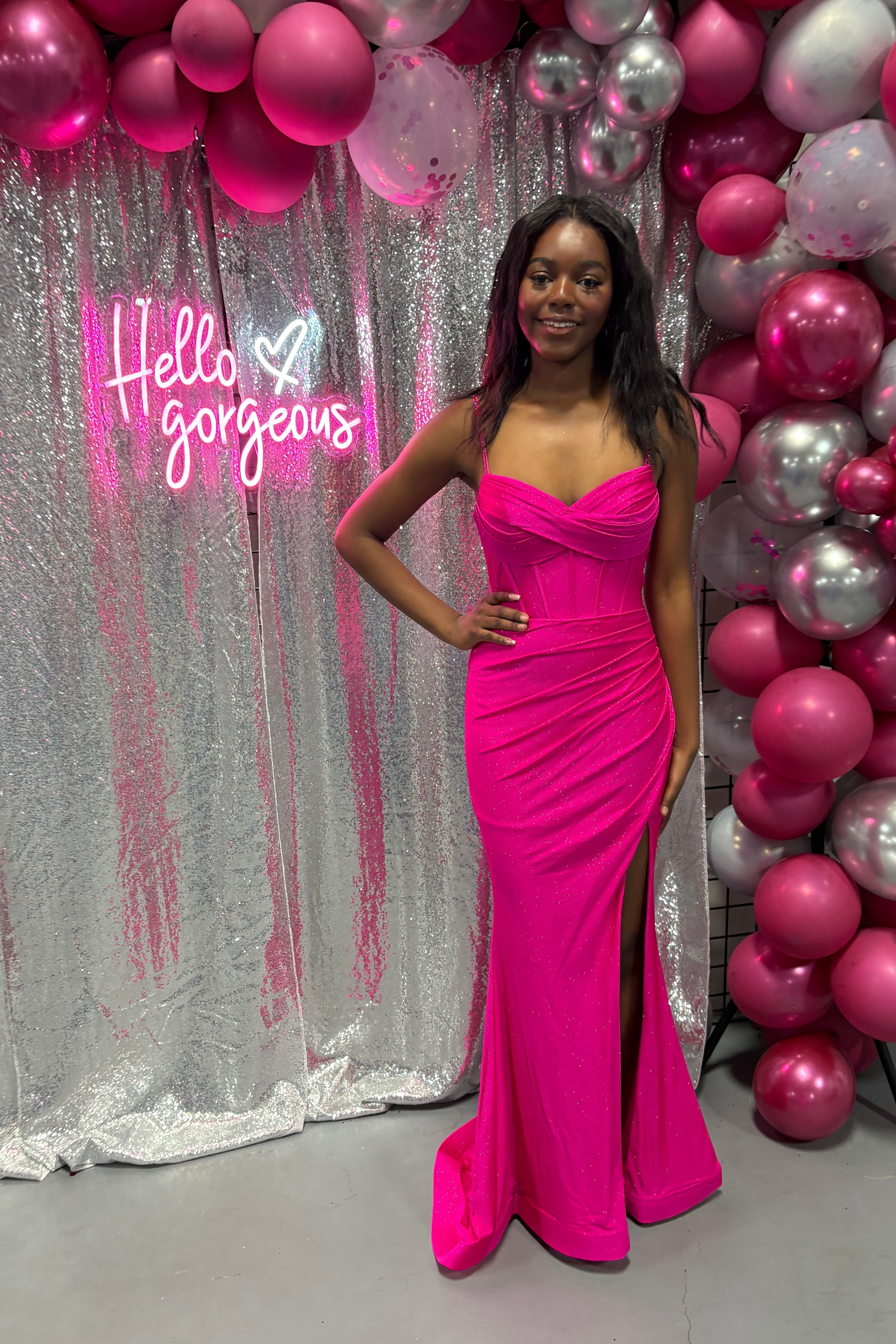 FLAIR Prom style 25009 available in Fuchsia as well as limited sizes in Royal Blue or Plum Purple is a fitted sheath dress with a slit and train featuring a draped bust corset style bodice.